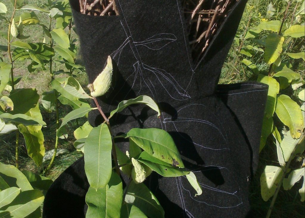 When does life begin? When does it end? Centered around grieving, this multi-layered work taps into Mexican death folklore, particularly the belief that Monarch butterflies embody the deceased. The site’s abundant milkweed plants (Monarch’s food) serve as the main graphic and thematic element. The fragility of life and the futility of the Monarch’s migration are echoed in the artwork: The shelter was constructed with water-soluble fabric. The performer’s movement triggered a motion-activated water sprinkler that caused the shelter to collapse, and the milkweed seeds in her torso to fall into the dress pockets. The dress is constructed with landscaping fabric, allowing the milkweed seeds to grow in certain areas with the pass of time. A continuation of the life cycle, a promise of life after death. Created during a 3-week long residency at The Tree Museum, in Gravenhurst, Ontario, Canada. Presented with support from the Canada Council for the Arts and Ontario Arts Council.